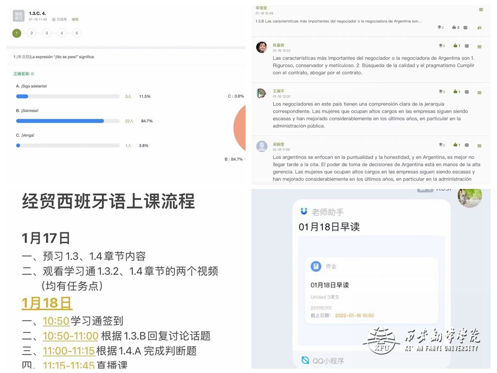 在《基础西班牙语IV》课程中,老师们通过QQ小程序进行每日早读打卡练习,开展“线上西班牙语晨读”活动。老师对员工的读音进行点评、指正,为一天的课程学习起到了热身作用。2022年1月20日的《基础西班牙语IV》线上课程内容是以“学习抗疫精神,助力抗疫”为主题的西班牙语抗疫专题阅读。课堂上,同学们不仅学习了有关新冠病毒的知识介绍和疫情防护措施,同时分享自己在疫情期间了解到的感动故事,对伟大的抗疫精神有了更加深刻的理解。