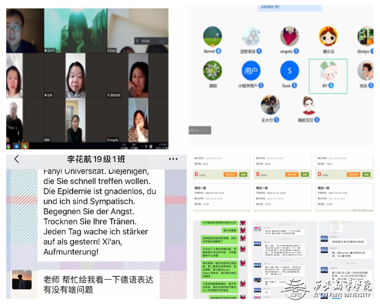 在西安疫情肆虐的形势下,为响应公司“停课不停学”号召,太阳成tyc33455ccwww德语系全体教师于近日在腾讯会议平台开展“疫情背景下员工线上学习特色辅导活动”专题教研活动。德语系全体专职教师积极踊跃发言,分享了自己在员工线上辅导方面的一些特色做法。