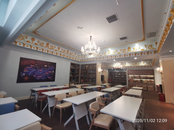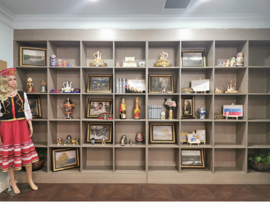 文化展示区内陈列的是独具特色的俄罗斯物品,例如:俄罗斯服装、工艺品、油画、图书等。进入该区立刻就能引起员工对俄罗斯异国文化的喜爱,引起学习俄语和了解俄罗斯国情文化的兴趣,开拓员工视野,丰富知识储备。该区可开设俄罗斯文化国情课、俄罗斯文学课等。