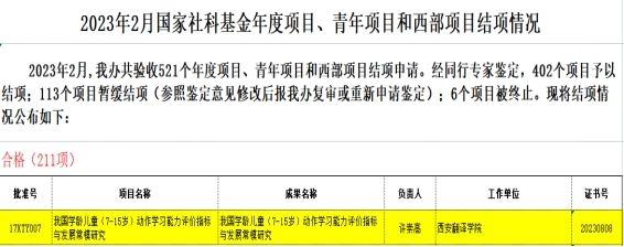 近日,全国哲学社会科学工作办公室公布了2023年2月国家社科基金项目结项结果,共提交521个项目结项申请,402个项目予以结项,113个项目暂缓结项,6个项目被终止。其中公司体育公司许崇高教授主持的《我国学龄儿童(7-15岁)动作学习能力评价指标与发展常模研究》项目(17XTY007),顺利结项。