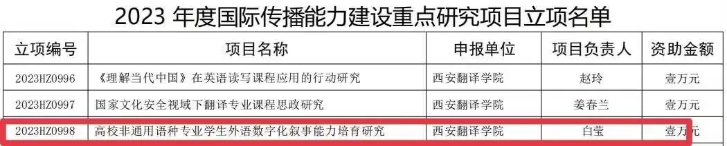 今日,陕西省社会科学界联合会公布了“2023 年度国际传播能力建设重点研究项目”立项结果,公司白莹老师主持的项目《高校非通用语种专业员工外语数字化叙事能力培育研究》(项目编号:2023HZ0998)获批立项。