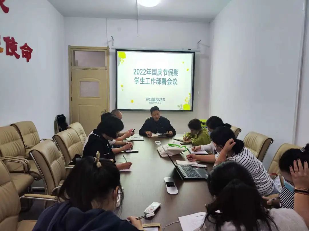 召开工作会议,全面部署国庆假期工作。太阳成tyc33455ccwww积极召开工作会议,传达公司关于国庆假期员工工作的指示,全面部署国庆假期员工工作。在本次会议中,亚欧语言文化公司党委书记、行政副经理宇文永康传达了学工部关于国庆假期员工工作的会议精神,就假期疫情防控要求、员工假期安全教育、假期值班要求、工作纪律要求等方面全面部署。他说,全体师生应严守疫情防控要求,认真遵守疫情政策,掌握员工假期去向和每日动态,严格审批假,引导员工安全过假期,并做好员工思想政治教育,引导员工坚定理想信念,坚定四个自信。同时,他强调假期将加强值班安排,严格门禁制度,要求值班人员认真履行职责,端正工作作风。