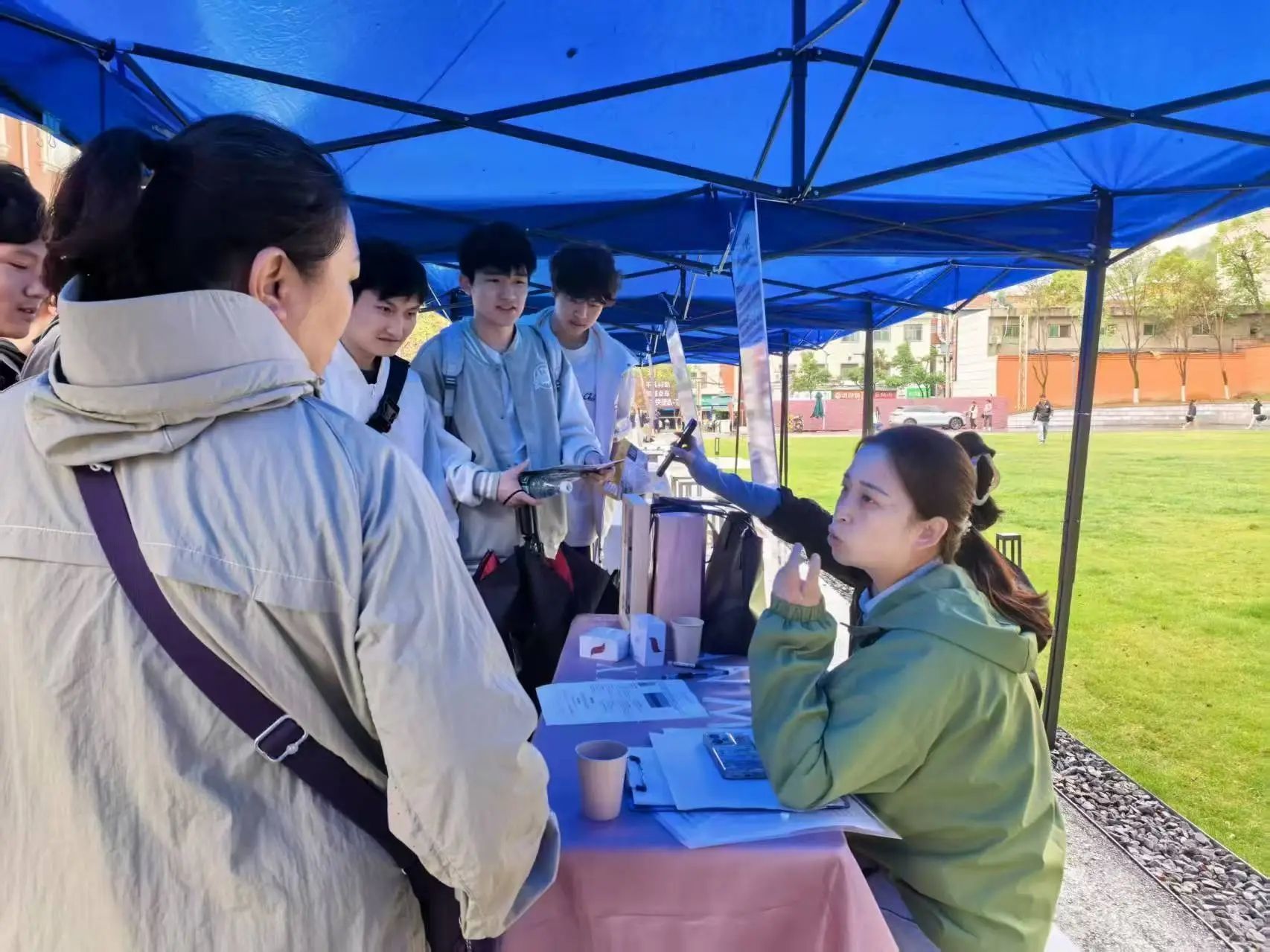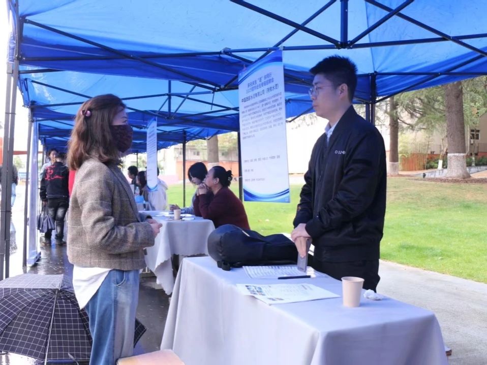 本次招聘会聚焦语言类专业特色,岗位涉及教学、涉外项目管理、跨境电商等方向,高度匹配公司小语种专业员工的职业发展需求。雨中,手持简历的毕业生穿梭于各展位前,与企业代表热情交流。