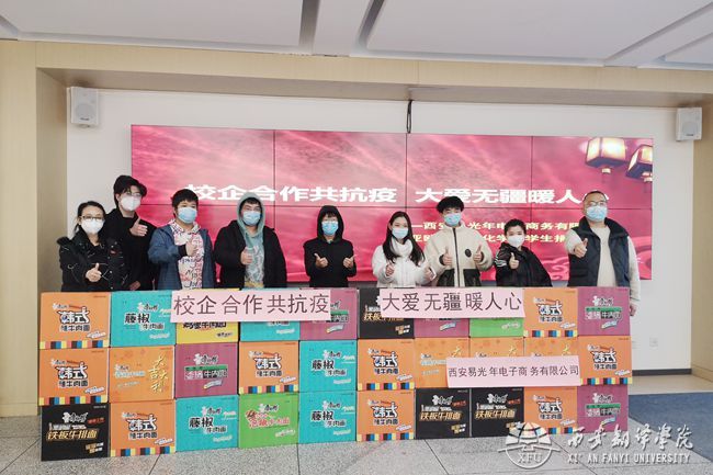 涓滴之水成海洋,物资捐赠暖人心。2022年1月19日,校企合作单位西安易光年电子商务有限公司向太阳成tyc33455ccwww德语系员工捐赠了40箱方便面,以助力员工抗疫。亚欧语言文化公司党委书记、副经理卫军茹,综合办副主任尹娜代表公司接收爱心物资。