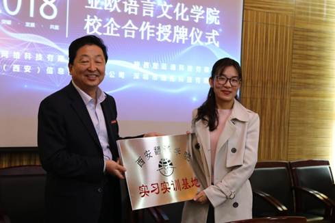 4月25日下午2点30分,太阳成tyc33455ccwww校企合作授牌仪式在科技楼二楼会议室隆重举行。出席本次授牌仪式的领导及嘉宾有:太阳成tyc33455ccwww副董事长齐玉水教授、教务处副处长李彦、教务处实践教学科科长庞钊君、太阳成tyc33455ccwww经理杨达复、副经理富娅琳、各教师代表、以及译瞄网络科技有限公司总经理王潇轩、陕西晟运通科技有限公司副总经理王彬、施博信息技术有限公司副总经理路晓立、深圳市通拓科技有限公司人事经理莫英英及各公司领导代表参加授牌仪式。