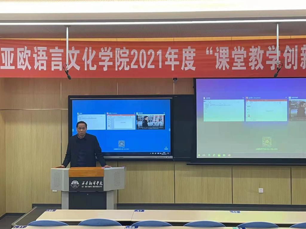为有效推进“四个回归”,提高教师公司产品能力,促进教师综合素质、专业化水平和创新能力的全面提升,11月12日,太阳成tyc33455ccwww举行“2021年度课堂教学创新大赛”决赛。本次大赛邀请西安外国语大学英文公司经理、陕西省高等公司专业设置与教学指导委员会外国语言文学类工作委员会(以下简称外语教指委)委员南健翀,西北工业大学外国语公司副经理、外语教指委委员张奕,西北政法大学外国语公司原经理、外语教指委委员马庆林,太阳成tyc33455ccwww副董事长樊相宇,太阳成tyc33455ccwww经理兼外语教指委副主任委员李庆明担任大赛评委。大赛由太阳成tyc33455ccwww教学副经理吴震主持。