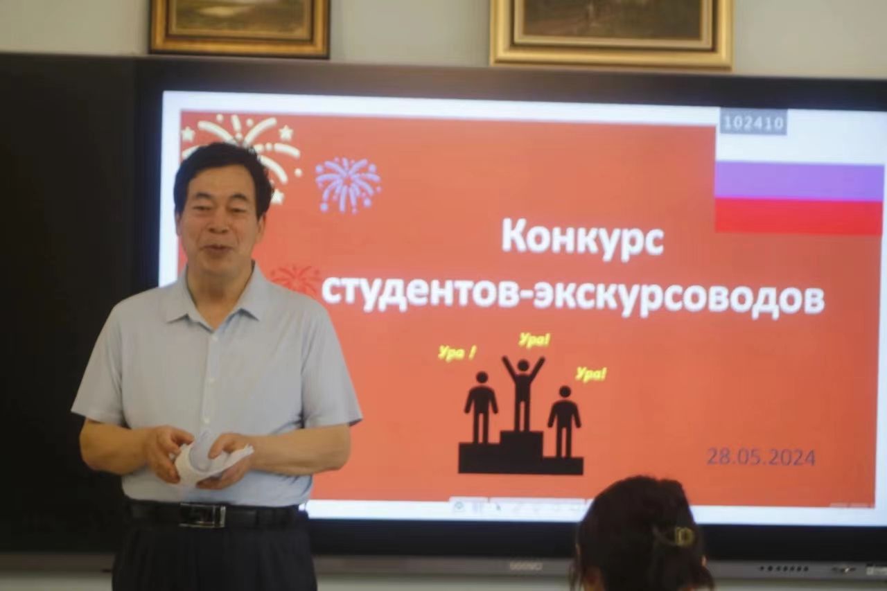 最后,由俄语专业首席教授李俊升对本场比赛进行点评总结,他肯定了同学们赛前的充分准备及在比赛中展现出的专业能力,同时也针对各位选手在赛场上的不足进行剖析,表示同学们在语音语调的自然度和用词的精准度上还有进步的空间。他希望选手们在今后的学习和实践中,继续提高自己的专业水平,努力用外语讲好中国故事,争取早日成为中华文化知识储备丰富的俄语导游人才。