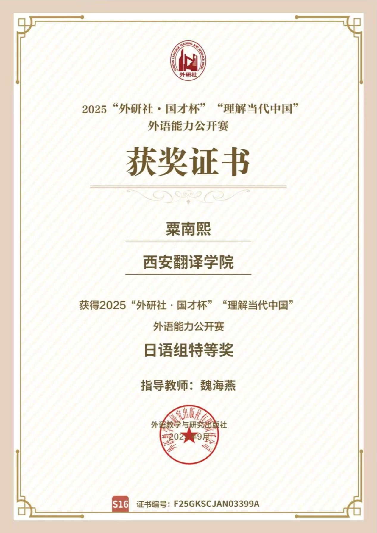2025年9月5日“外研社·国才杯”“理解当代中国”外语能力公开赛(多语种组)圆满落下帷幕。此次大赛吸引了来自全国400余所高校的多语种精英学子云端竞技,共展外语风采与时代理解深度,公司日语专业学子粟南熙在这场激烈角逐中脱颖而出,斩获佳绩。