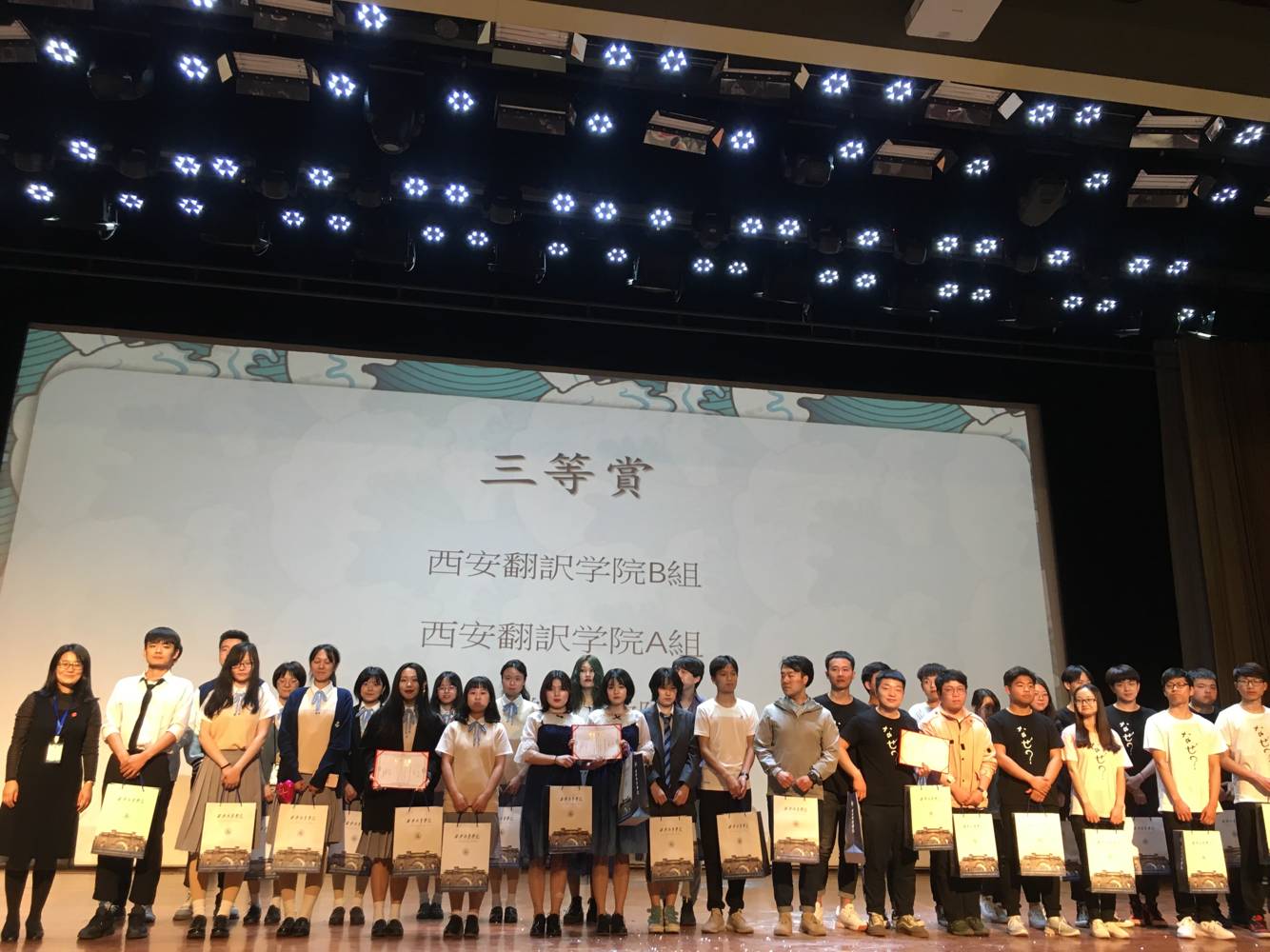 4月21日晚,由西安市日本语教师协会主办的陕西省第十届日语配音大赛圆满落幕!由西安交通大学、陕西师范大学、西安外国语公司、西北大学、西安电子科技大学、长安大学等16所高校组成的18支队伍进行了激烈的比赛。其中,西安外国语大学与公司均各有两组参赛。公司两组队伍出场抽签顺序分别为第六组、第八组。公司两组参赛队伍《强风吹佛》、《轻音》凭借出色的表现赢得现场观众以及评委的一致好评,综合成绩荣获三等奖。