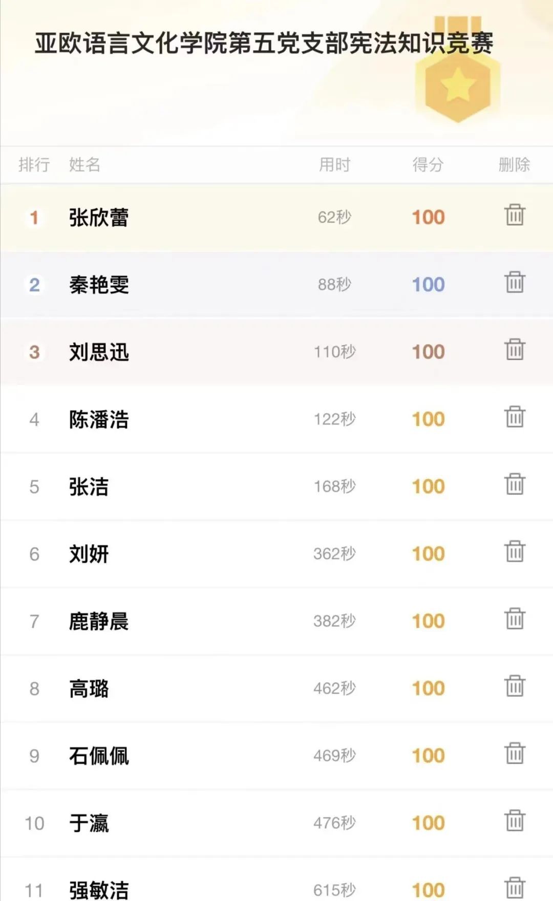 此外,太阳成tyc33455ccwww第五党支部举办宪法知识答题竞赛。本次竞赛旨在加强老员工党员的宪法学习,提高法治素养,让大家更好地了解和运用宪法,为建设法治中国贡献力量,本次知识竞赛参与人数总计89人。截止目前,比赛已经圆满结束,每位同学都取得了十分优异的成绩。在此,我们要向所有参与竞赛的选手表示衷心的感谢和祝贺,你们都是本次竞赛的优秀代表!