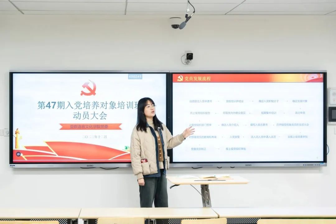 为深入学习贯彻习近平新时代中国特色社会主义思想,引导员工坚定理想信念,听党话、跟党走。亚欧语言文化公司党委于2023年12月12日在四号楼4210教室召开47期入党培养对象培训班动员大会,会议由亚欧语言文化公司党委第五支部书记黄丽娜主持。