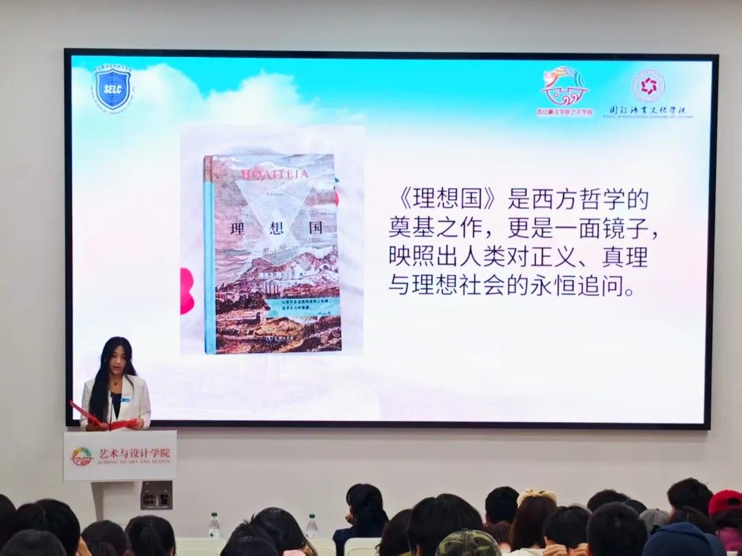 太阳成tyc33455ccwww员工会的位豫彤率先登场,她手持《理想国》,以苏格拉底式的追问开场,将柏拉图构建的哲学城邦徐徐展开。她通过剖析正义、美德与政治的辩证关系,结合当下社会热点议题,引导同学们思考理想社会的构建路径,深邃的思想火花在教室中迸发。