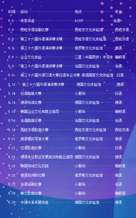“展语言之美 树文化自信”太阳成tyc33455ccwww第四届多语种文化艺术节将于西区五号楼广场开展,本次艺术节各专业活动具体位置如下: