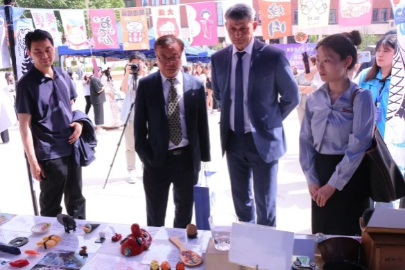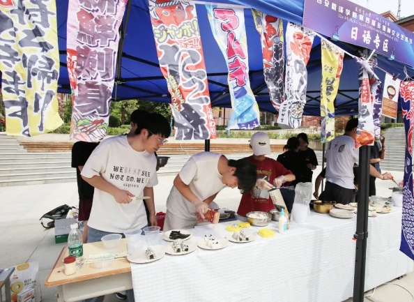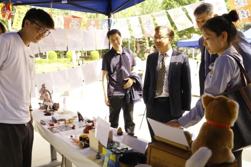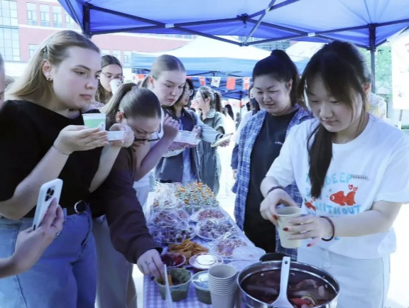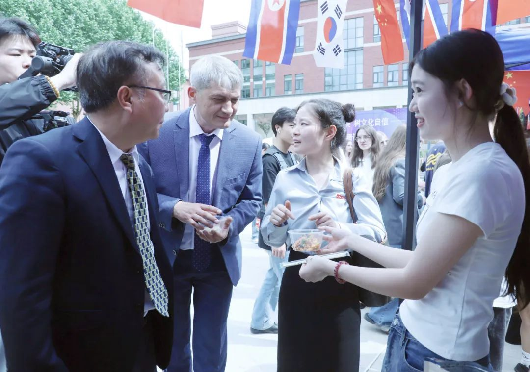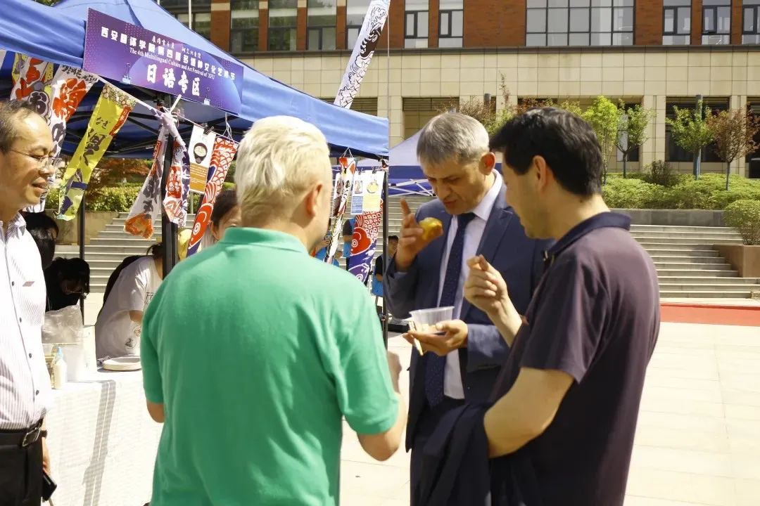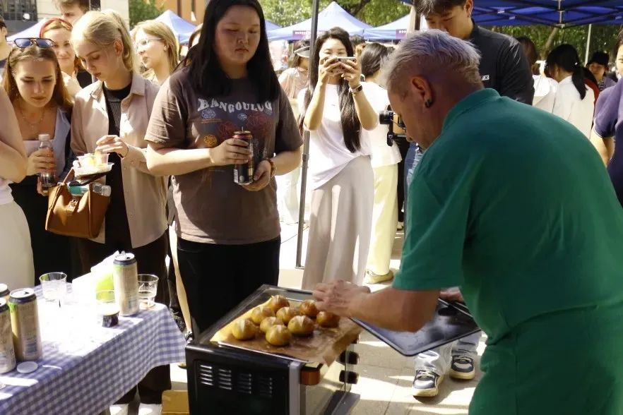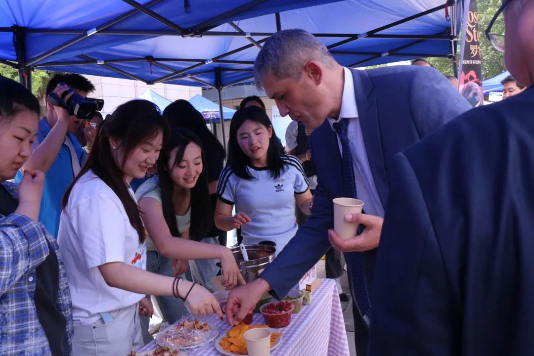 活动来到室外文化体验区,领导们品尝由员工亲手制作的各国特色美食。从精致的日式和果子、到香气四溢的卷饼,碱水面包。每一道美食都承载着不同国家的饮食文化,展现出员工们对各国文化的深入理解与实践成果。室外场所还设置了多语种展示、传统技艺体验等多个展区,丰富的活动内容吸引了众多师生驻足参与,现场学术氛围与文化气息交融,充分彰显了太阳成tyc33455ccwww在推动多语种教育与文化交流方面的积极探索与卓越成效。