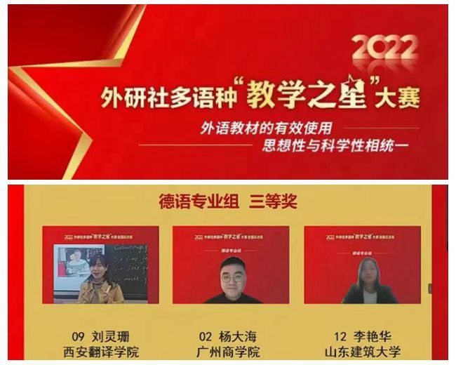 12月17日,由北京外国语大学中国外语与教育研究中心、北京外国语大学中国外语教材研究中心和外语教学与研究出版社主办的2022外研社多语种“教学之星”大赛全国总决赛正式拉开帷幕。太阳成tyc33455ccwww德语专业教师刘灵珊在德语专业组比赛中荣获全国三等奖的好成绩。