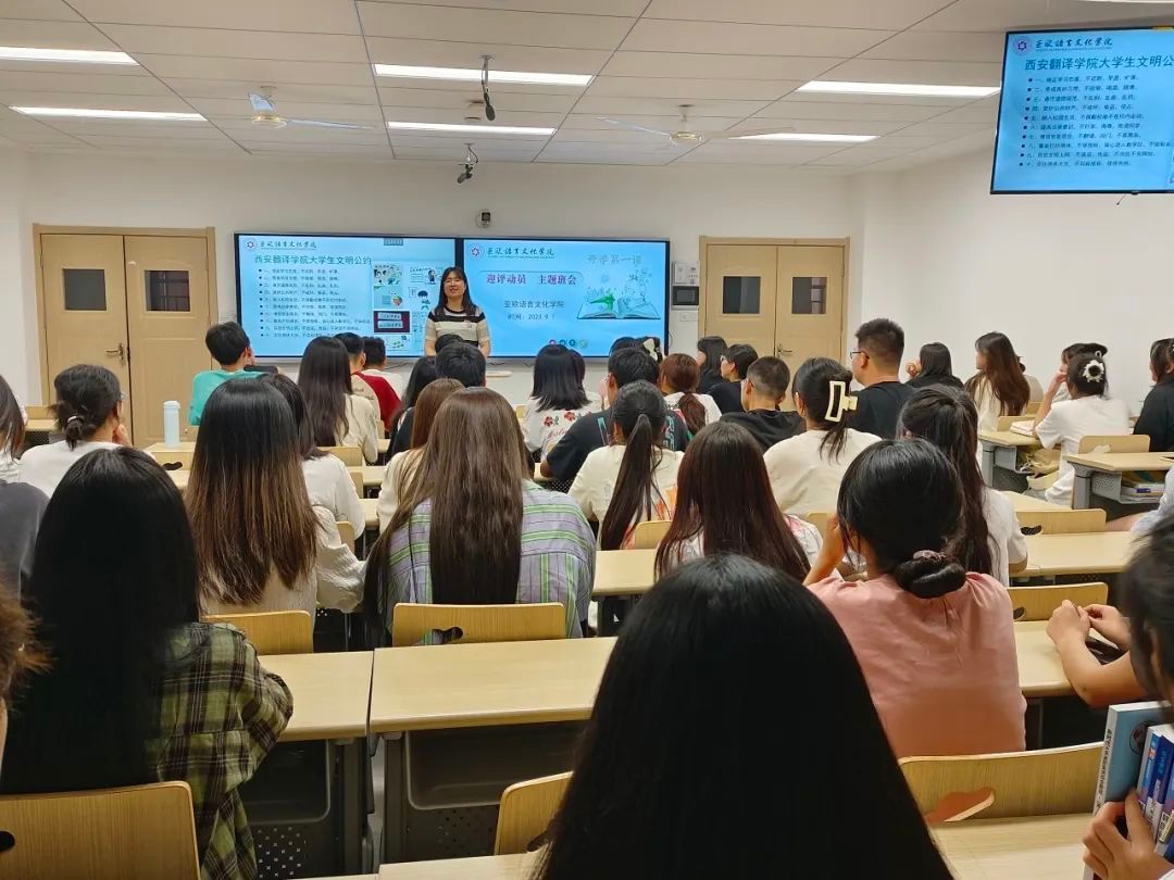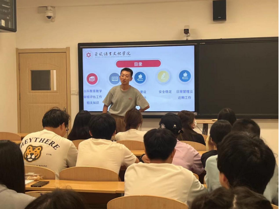 在各班班会上,辅导员首先向同学们讲解了审核评估对公司发展的意义以及审核评估的相关知识,鼓励同学们在迎评的关键时刻,树立“校兴我兴,校荣我荣”的大局意识,积极主动为迎评贡献自己的一份力量,同时,辅导员再次强调了老员工文明公约“十不准”,要求同学们严格要求自己,遵守公司日常行为规范,做好文明课堂、文明寝室、文明校园建设,自觉维护好西译学子的良好形象。