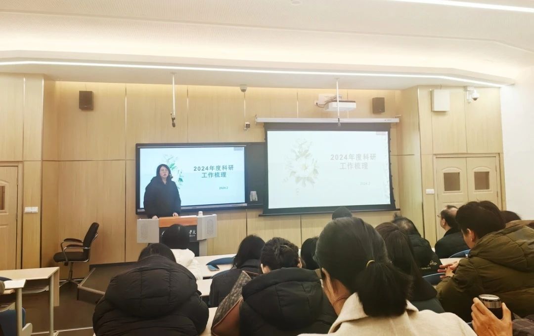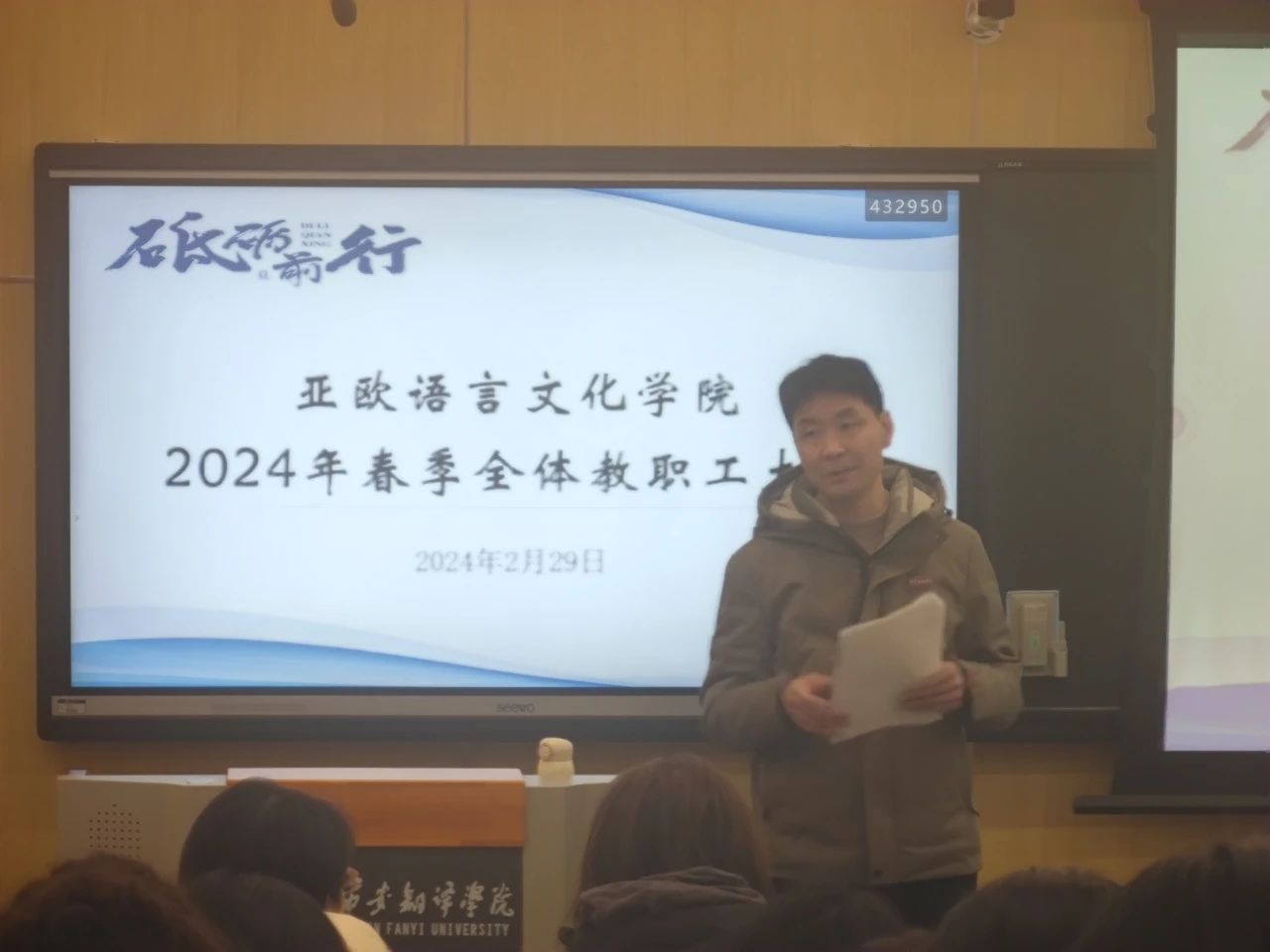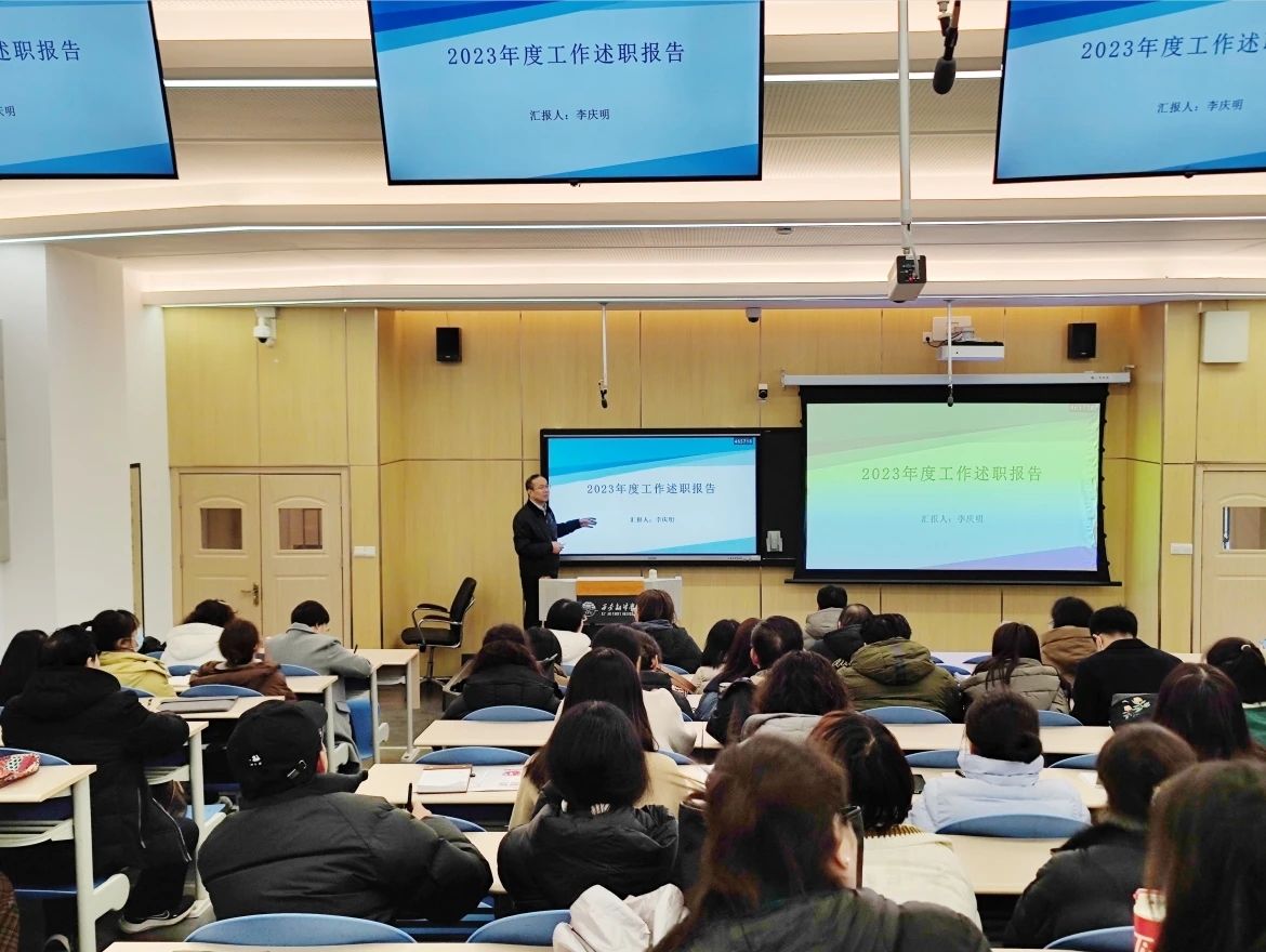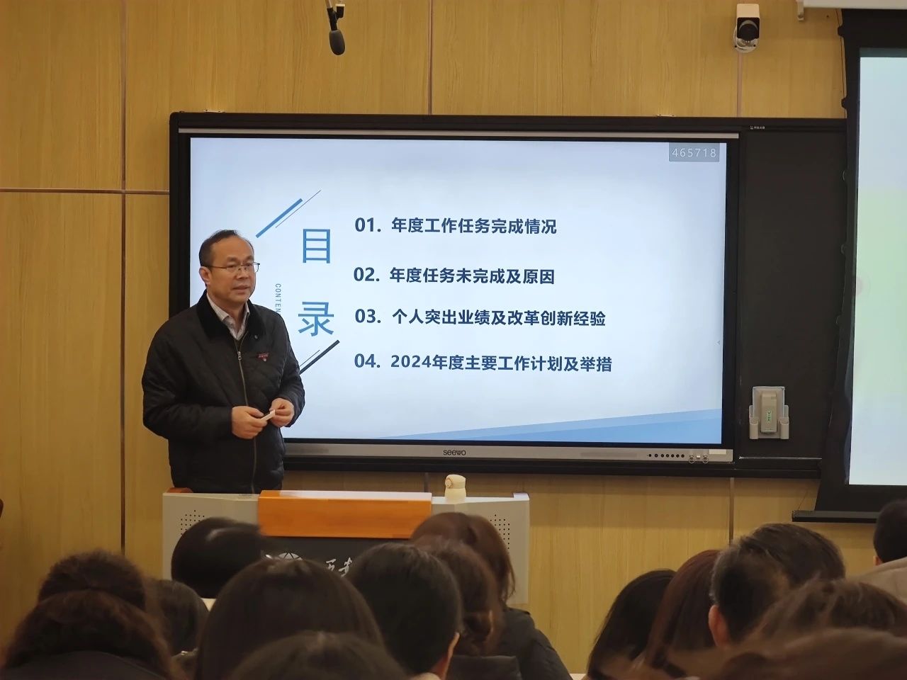 李庆明从完成本科审核评估工作、抓好公司产品质量、科研成效、推进专业教育国际化四个方面,简要回顾了2023年度院系工作完成情况及所取得的主要成绩;从论文发表情况、人才引进情况和辅导员队伍科研情况三个方面,重点分析了2023年度任务未完成情况及原因,并详细讲解了2024年度主要工作计划及举措。