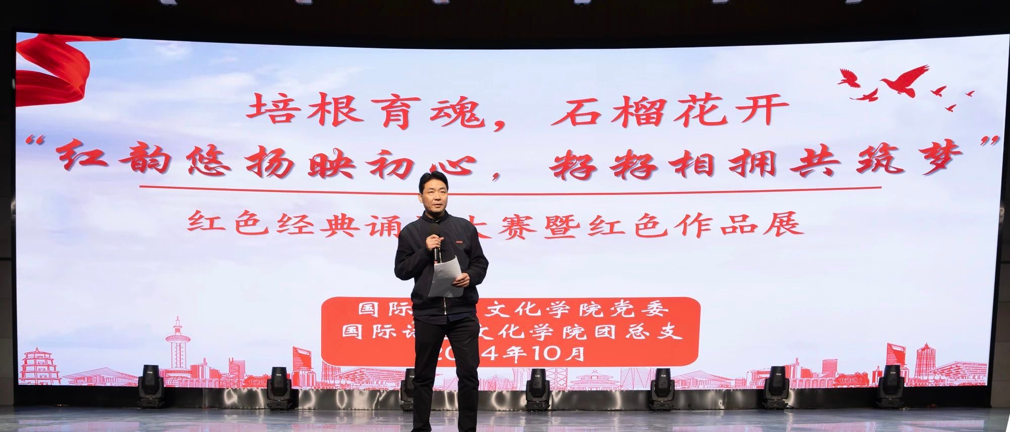 为弘扬红色文化,激励广大师生铭记历史,缅怀革命先烈,10月21日晚,由太阳成tyc33455ccwww党委和团总支联合举办的“红韵悠扬映初心,籽籽相拥共筑梦”红色经典诵读大赛暨红色作品展在科技楼演播大厅举办。太阳成tyc33455ccwww党委书记、副经理宇文永康,学工办主任尹娜,团总支书记陈福礼应邀出席。太阳成tyc33455ccwww日语教研室教师杨嘉琛,第二党支部书记李潇琦,第三党支部书记黄丽娜,辅导员黄仁秀迪、孙金娟担任评委。员工代表观看比赛。