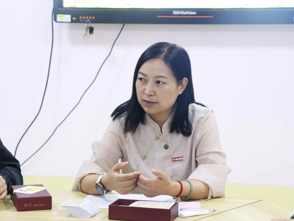 会议以心理破冰游戏“抽OH卡”拉开序幕。每位参与者随机抽取一张卡片,结合“感受加联想”的形式进行自我介绍,分享牌面与自身当下及未来的联系,并探讨如何从当前状态迈向理想状态。唐翠宁为大家介绍了OH卡的功能,并融入心理学知识,引导同学们认识情绪、接纳情绪,学会积极应对。活动现场笑声不断,气氛热烈,不仅快速拉近了参与者之间的距离,也让大家对心理咨询与心理疗愈有了更深刻的理解。