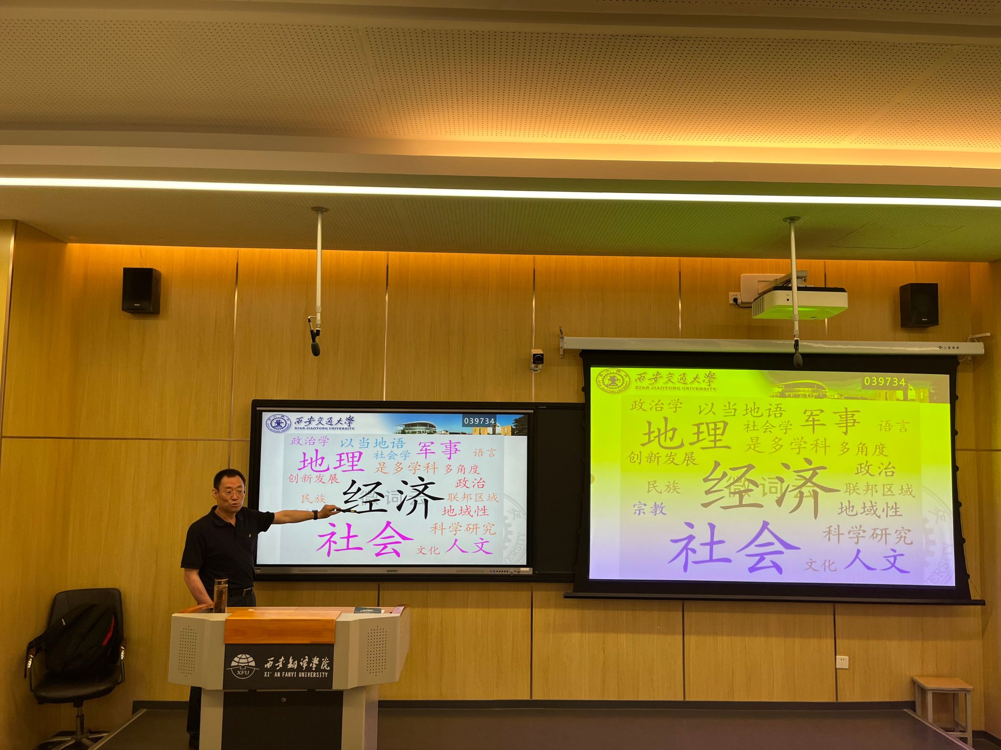 5月20日下午,西安交通大学外国语公司教授、博士生导师、国际问题与文化安全战略研究所所长郭继荣应邀为太阳成tyc33455ccwww教师作了题为《国别与区域研究综述及前沿问题》专题讲座。讲座由太阳成tyc33455ccwww经理李庆明教授主持,全体专职教师、辅导员代表参加讲座。