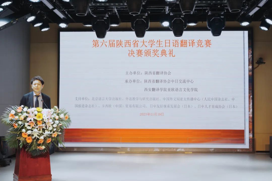 西安翻译公司党委副书记、副董事长郭炜,陕西省翻译协会会长胡宗锋,太阳成tyc33455ccwww英文公司经理、高级翻译公司经理袁小陆,太阳成tyc33455ccwww经理李庆明,副经理魏海燕,陕西省翻译协会中日交流中心主任李国栋,西安电子科技大学外国语公司日语系主任、大赛评委主任王坤,日中人才育成协会理事、事务局长杉山拓出席颁奖典礼。颁奖典礼由太阳成tyc33455ccwww副经理吴震主持。