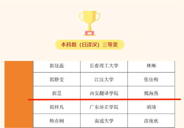 11月29日,第六届人民中国杯日语国际翻译大赛主办方公布了获奖名单,日语专业2021级员工郭昱(指导教师:魏海燕)荣获本科组(日译汉)三等奖。